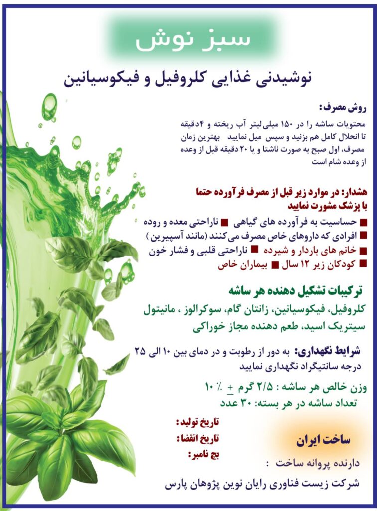 سبز نوش خرید محصول سبز نوش انتی اکسیدان طبیعیکمک به کاهش رادیکال های آزاد کمک به کاهش التهاب عضلات و ریکاوریکمک به عملکرد سیستم عضلانیروش مصرف :محتویات ساشه را در 150 میلی لیتر آب سرد ریخته 4 دقیقه تا انحلال کامل هم بزنید حاوی کلروفیل و فیتوسیانین